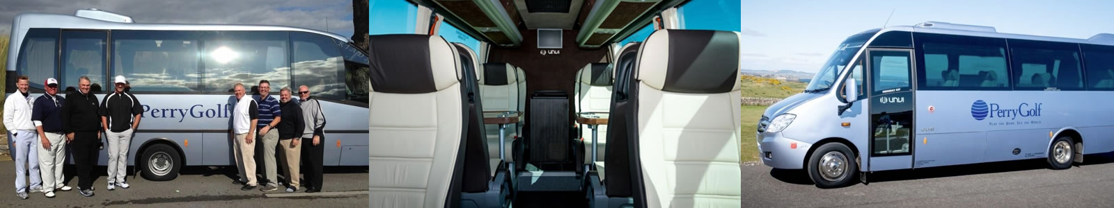 PerryGolf’s VIP Coaches, originally introduced in 1998, set the standard for small group transportation. We used a Mercedes chassis, originally designed to accommodate 20 passengers, and completely reconfigured both the interior and storage to provide an ideal environment for groups of 8 to play, relax and sightsee. It began with spacious leather armchairs, each with its own armrests and facing a table. Since then, the vehicles have evolved with different sizes but always the current amenities any traveler would reasonably anticipate. The vehicles are fully air-conditioned and equipped with a refrigerator plus an ice box stocked with soft drinks and bottled water. The secure storage area is compartmentalized with individual space for clubs, shoes and clothing that needs to hang.